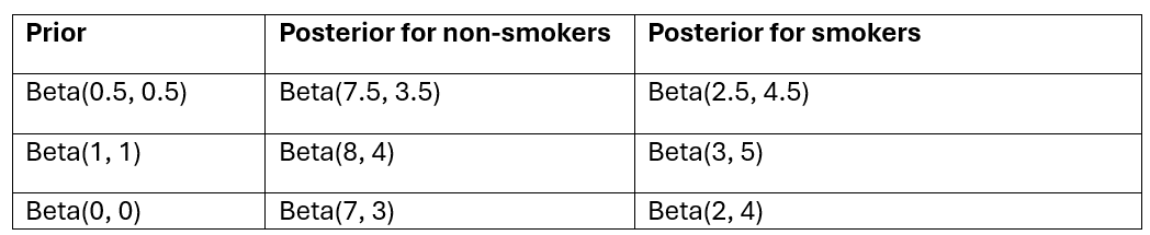 But whereas Beta(1, 1) assumes that extreme outcomes are as likely as any other outcome, Beta(0.5, 0.5) and Beta(0, 0) assume that extreme outcomes are much more likely than anything else by placing huge probability masses on them. The posteriors from Beta(0, 0) here can be proper if there is at least one COPD and one non-COPD case in each group. Otherwise they become improper by integrating to infinity as opposed to integrating to one.