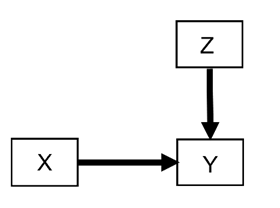 - Prognostic effects (also known as “risk magnification”, “risk modeling”, “risk score analysis”, “effect measure modification”, “additive effect”, “main effect”, or “heterogeneity of effect”). In an RCT (no arrow towards treatment choice X) they correspond to the following DAG whereby X is the treatment choice, Y is the outcome of interest, and Z is a covariate (such as patient age) affecting the outcome Y but not the pathway that mediates the treatment effect from X: