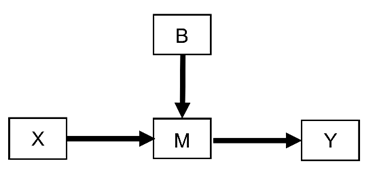 - Predictive effects (also known in the literature as “effect modeling”, “treatment interaction”, or “multiplicative effect”). In an RCT (no arrow towards treatment choice X) they correspond to the following DAG whereby X is the treatment choice, Y is the outcome of interest, and B is a covariate affecting the pathway M that mediates the effect of X on Y: