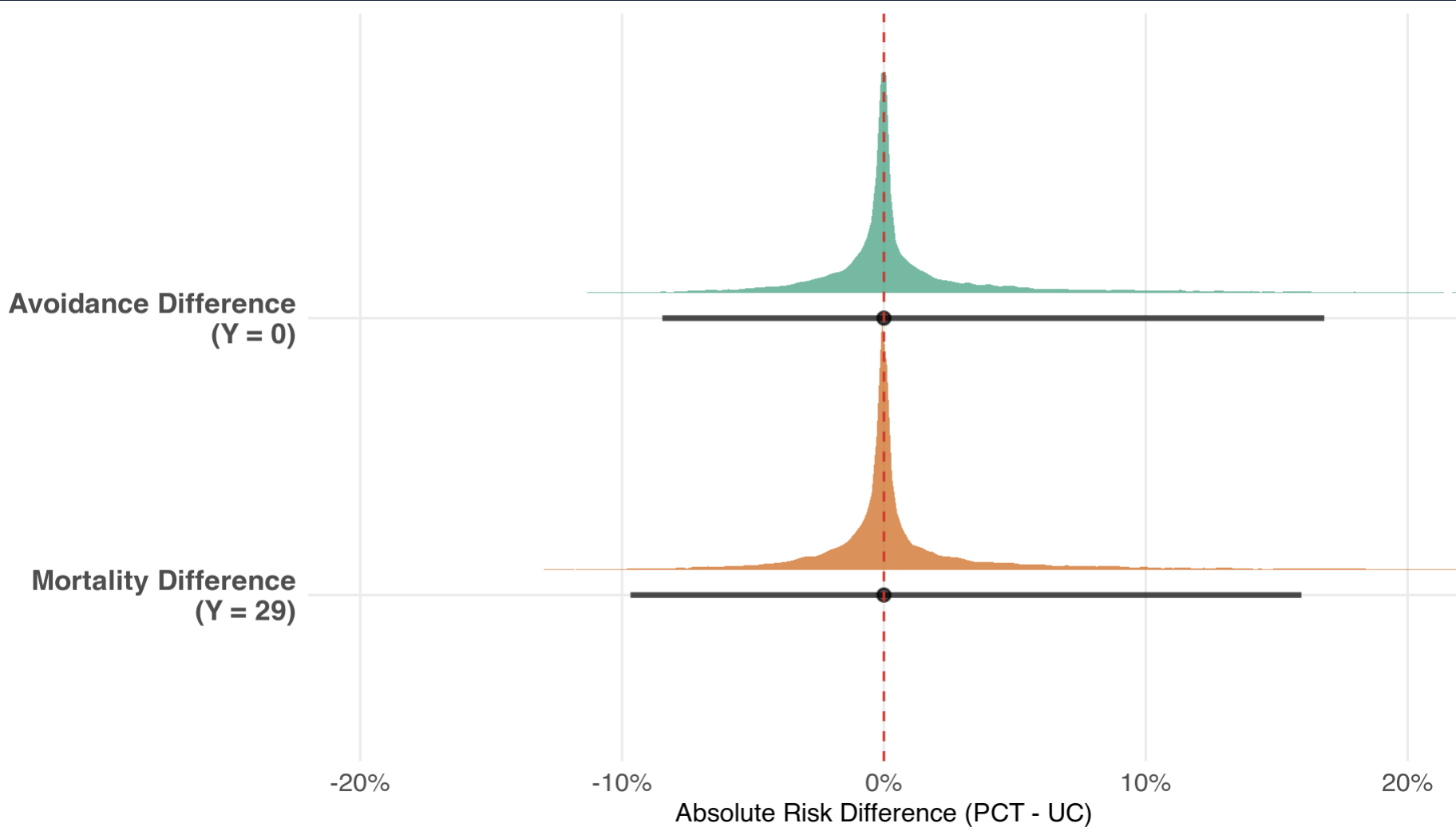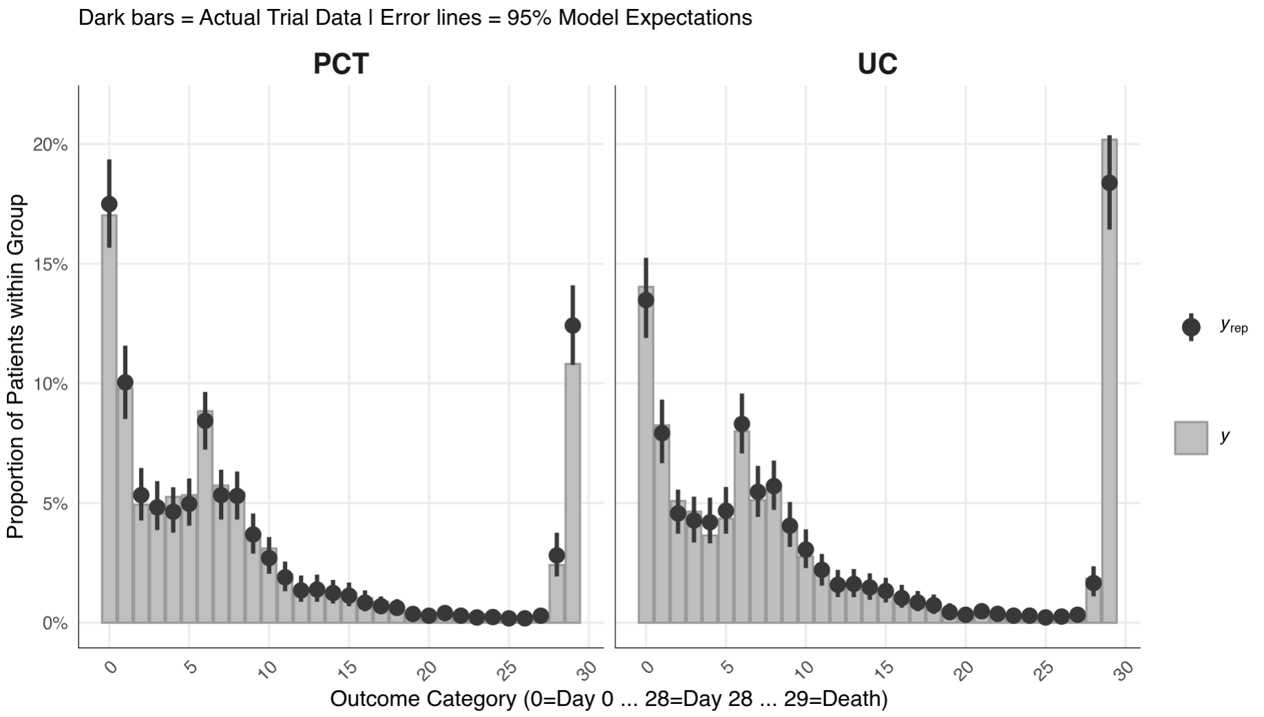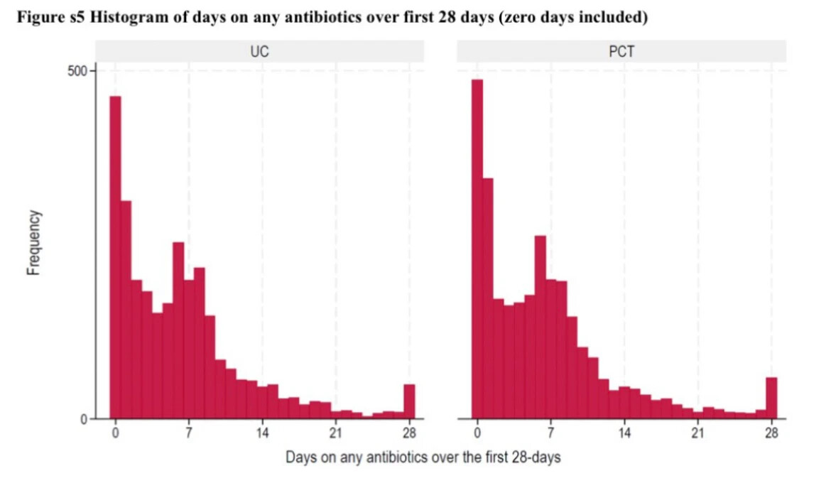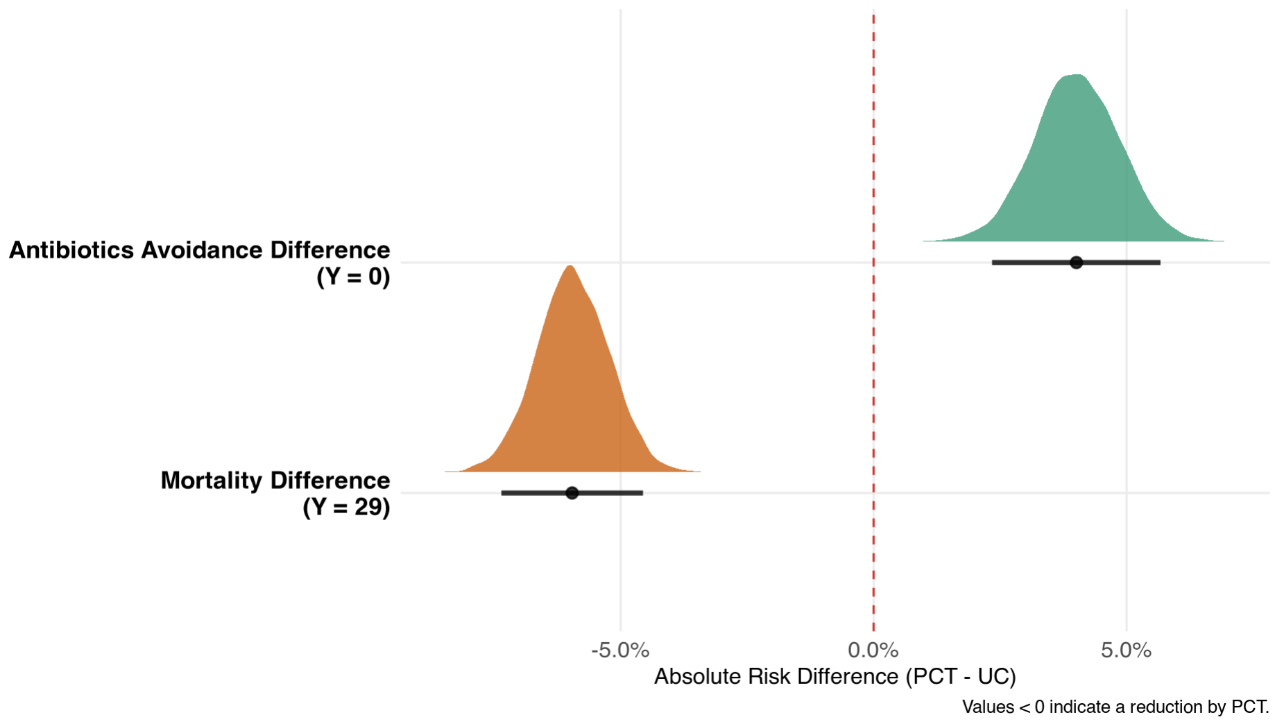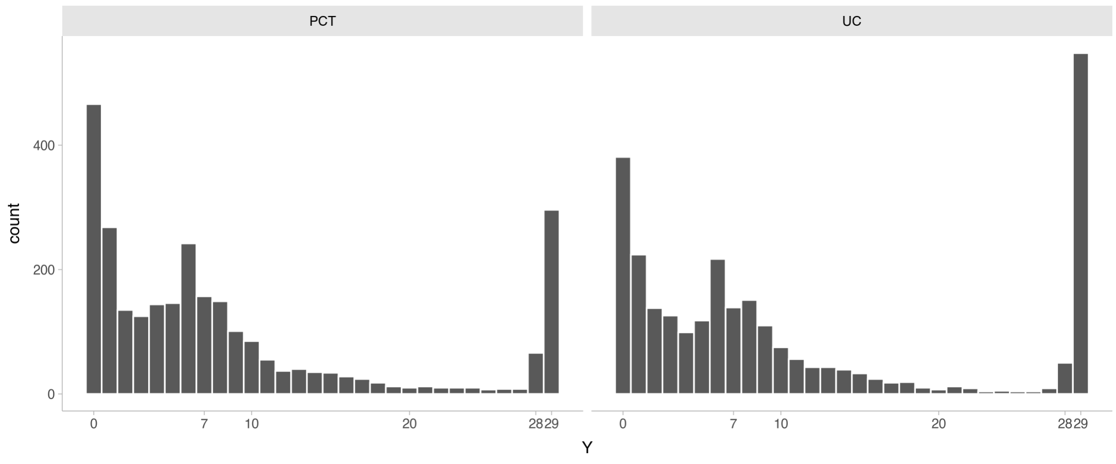 Imagine we have data from a RCT comparing two strategies (experimental = PCT and control = UC). These strategies aid physicians to decide whether a patient needs treatment with antibiotics or not. We then measure the number of days patients were treated with antibiotics for up until 28 days and if they were dead or not at the end of follow-up of 28 days.