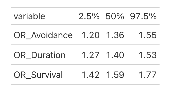 real OR_Survival = exp(-(beta_duration + tau_death));