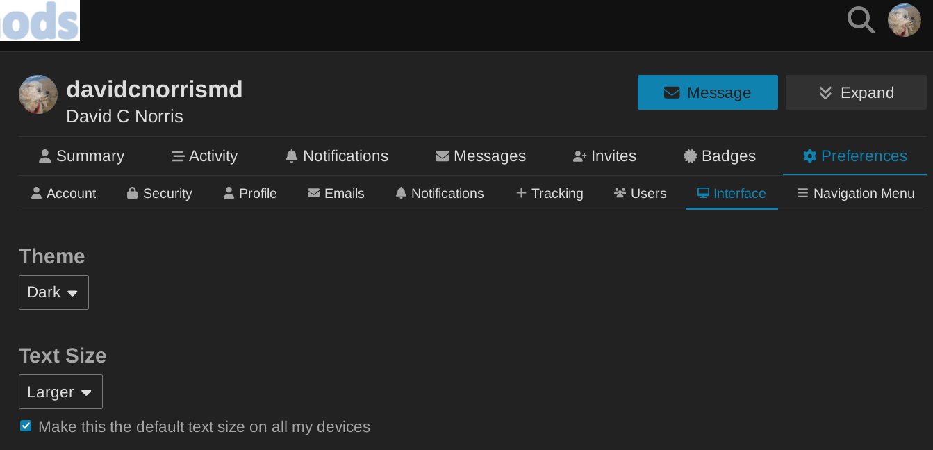 This is just an FYI I wish I had known about earlier. There is a Dark Theme you can set as shown in the screenshot below, from the Profile menu available when you click your avatar. As you can see in the image, you then select