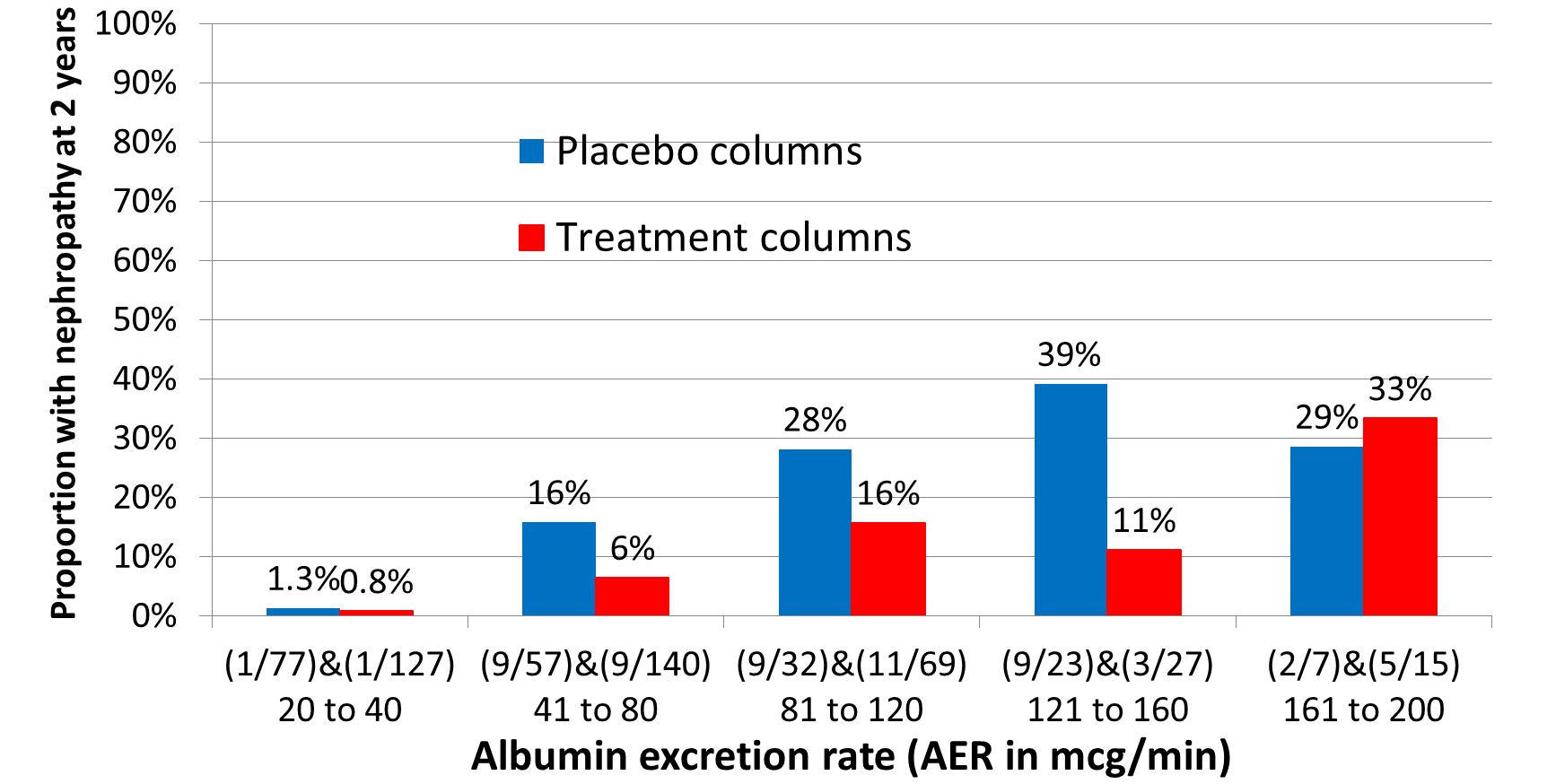 I fitted logistic regression curves to the probabilities / odds of nephropathy for the 5 strata conditional on the AERs for placebo and treatment and showed that the odds ratio and risk ratio varied with severity both being about 0.7 at 20mcg/min but diverging markedly at higher levels of AER the OR being parabolic in shape but the RR falling progressively.