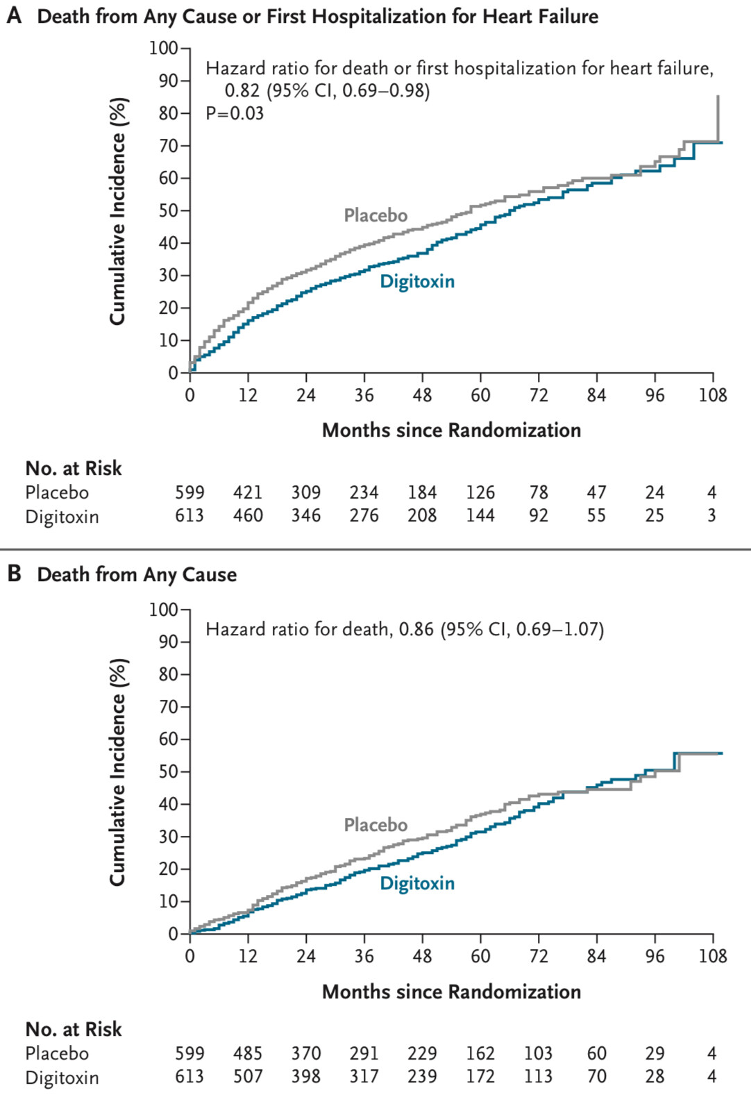 My thought was, if one would cut the time into two sections, the first 48 months and then after the 48 months. In the first 48 months there would be a clear benefit. In the months after month 48, one can restart the survival curves at the same level and Digitoxin would have a much higher event rate.