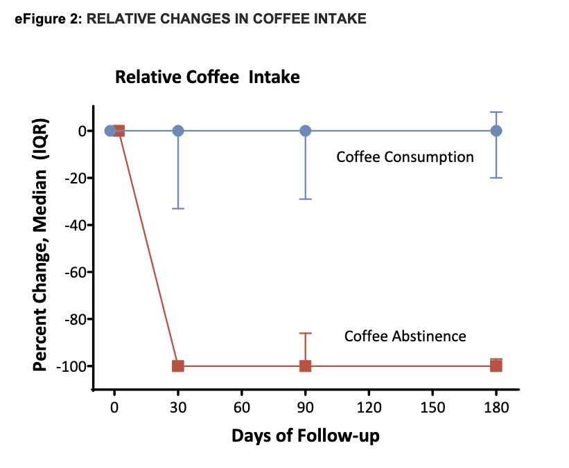 “Seventh, adherence in the abstinence group was also suboptimal, with only 69% not consuming any coffee. However, this does raise the possibility that these results might underestimate the true magnitude of benefit from coffee.”