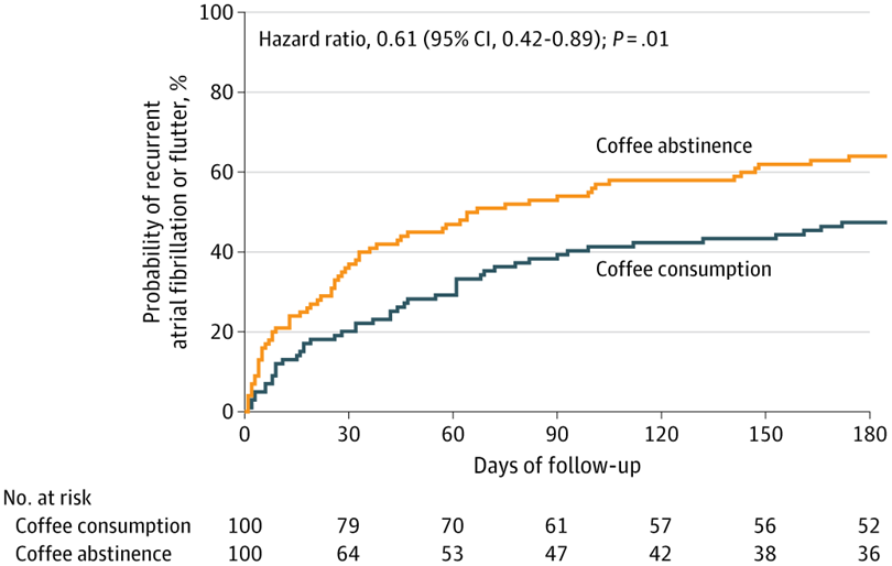 The study & media are reporting that coffee consumption may lower the rate of AF. The abstract results state: “In the primary analysis, AF or atrial flutter recurrence was less in the coffee consumption (47%) than the coffee abstinence (64%) group, resulting in a 39% lower hazard of recurrence (hazard ratio, 0.61 [95% CI, 0.42-0.89]; P = .01).”