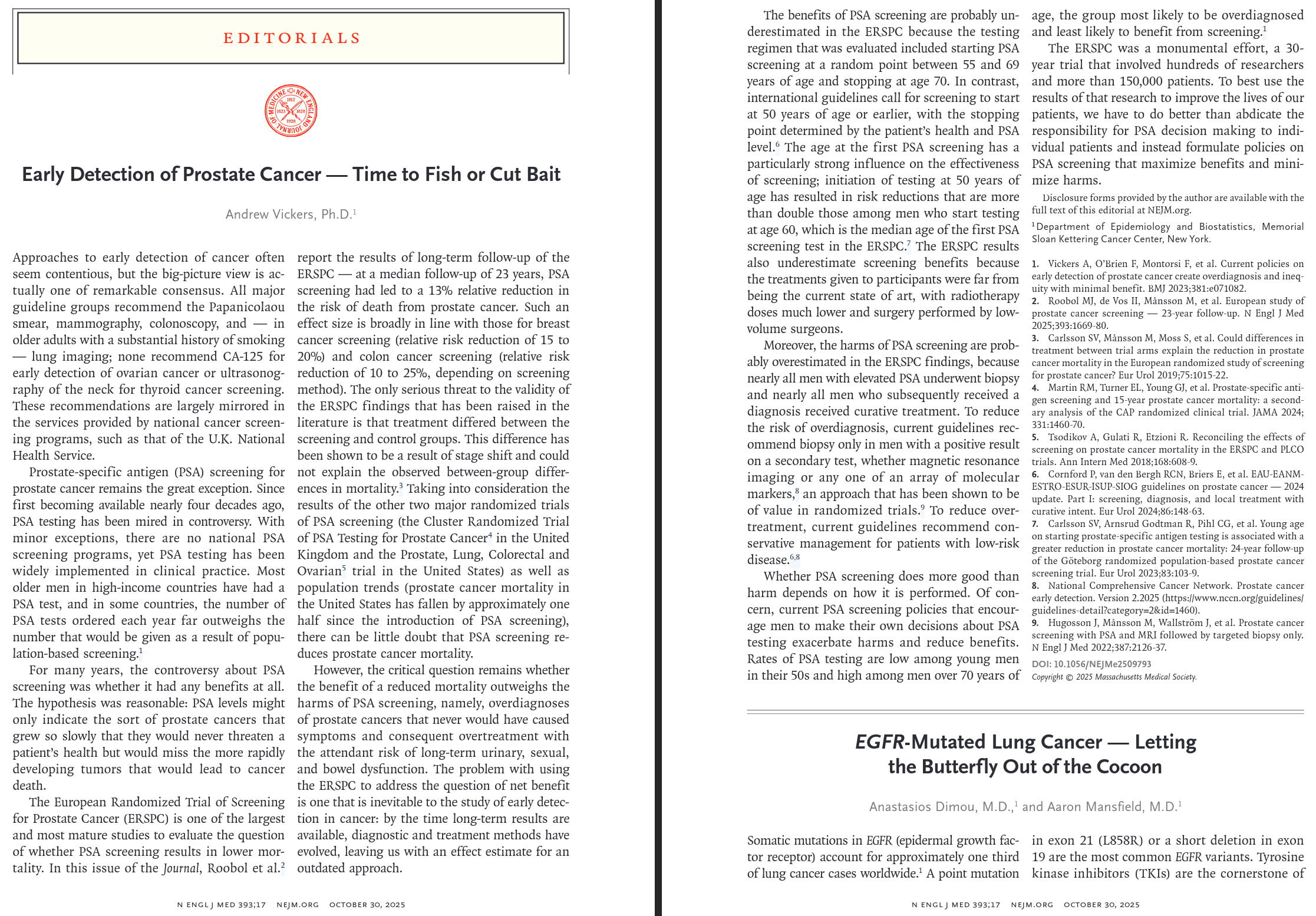 - Vickers A. Early Detection of Prostate Cancer — Time to Fish or Cut Bait. N Engl J Med. 2025;393(17):1742-1743. doi:10.1056/NEJMe2509793