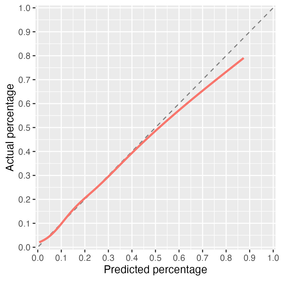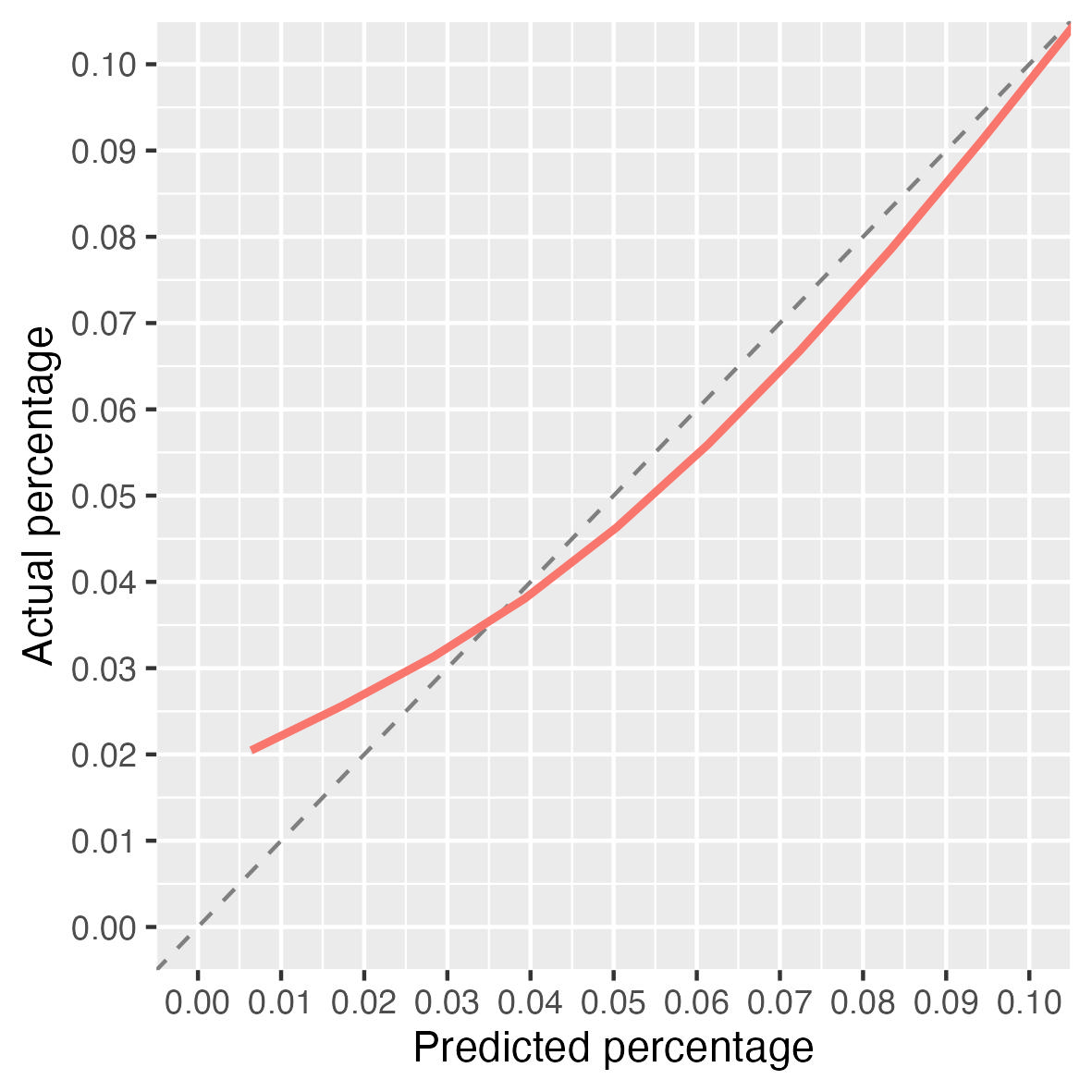 Note that your axis labels are incorrect. These should be Predicted Risk and Actual Risk or Predicted Probability and Actual Probability as they are not percents.