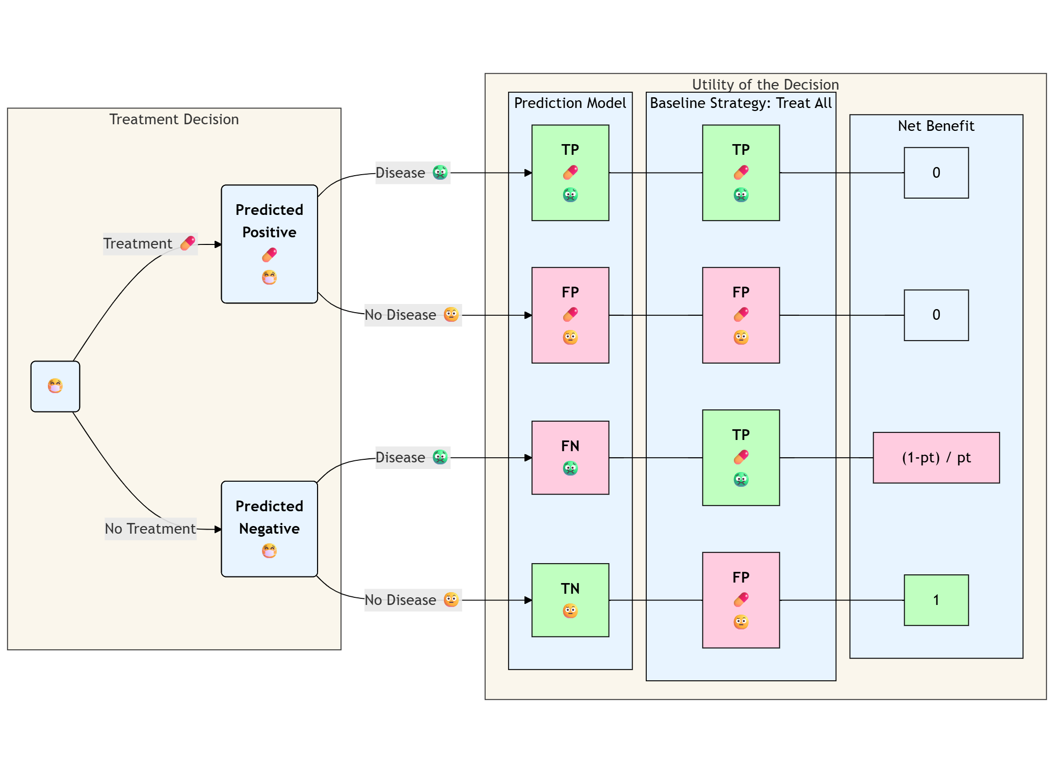 Otherwise it might be misleading to think about observed classifications the same way we are used to. “True-Positive” for treated patients is a bad think in the context of outcome prevention: