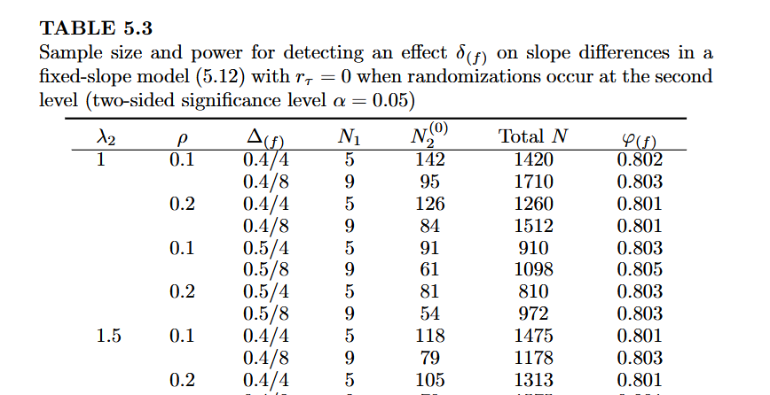 Three: it appears that many of these calculations are based on the book Sample Size Calculations for Clustered and Longitudinal Outcomes in Clinical Research. Sponsored by LLMs, I was able to reproduce their table 5.3