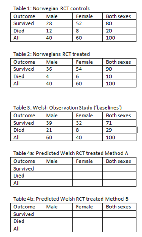 Hi again Suhail @s_doi. In order to clarify things with a fresh example, would you please apply Methods A and B to to predict the two possible results of a study in Wales (Tables 4a and 4b) from a baseline observational study in Wales (see Table 3) and the known result of a RCT in Norway (see Tables 1 and 2). This exercise was suggested by @AndersHuitfeldt during an explanation to me in post 540 Should one derive risk difference from the odds ratio? - #540 by HuwLlewelyn). Would you please show the results of applying Methods A and B by filling in the blank spaces in Tables 4a and 4b below.