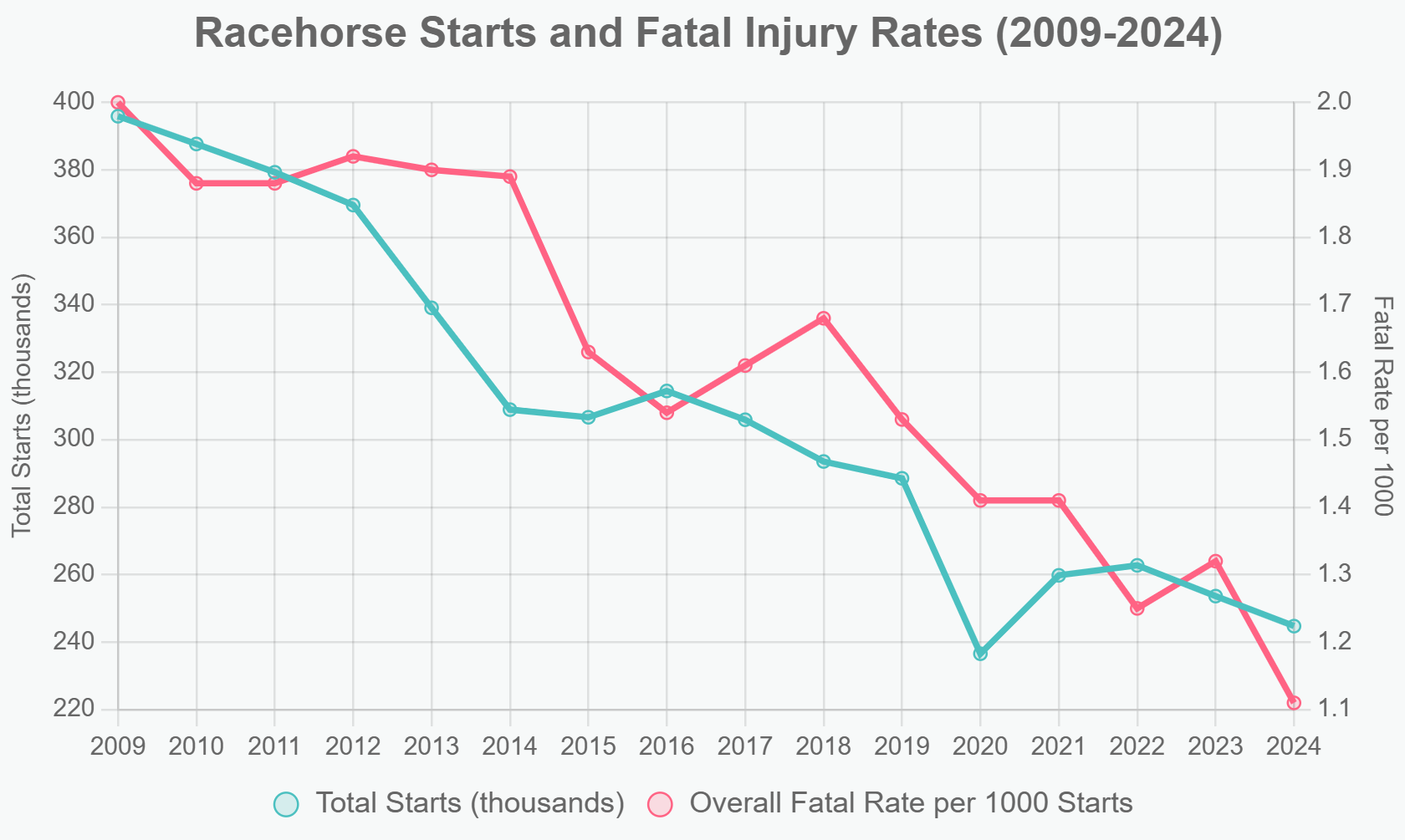 I understand horse racing is a controversial topic… that is not the point of this question. Due to incidents where horses suffered life threatening musculoskeletal injuries during races a lot of interest in employing various policies to reduce these events and even Congressional policy have been implemented. The metrics they use for success are measuring the fatality rate per 1000 race starts yearly and now on a quarterly basis. In comparing raw data year to year for a rare event they are mainly looking at noise in my opinion… would a five year moving average be a better metric?