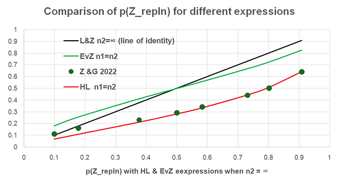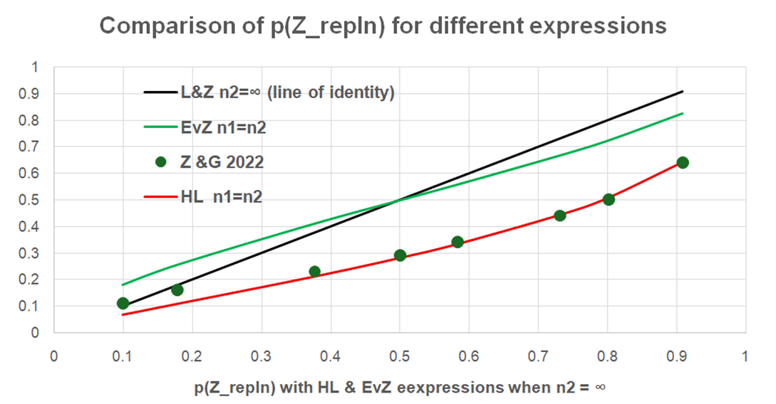 What we are doing of course is trying to derive mathematical models to predict the result of a natural process, which is always difficult (like medical prognosis). When n2 = ∞, then both EvZ and HL expressions give the same probability of replication. For example in your two simplified examples, when n2 = ∞, instead of √2 in the denominators we would get √1 and EvZ and HL expressions give the same result of ɸ(b/1-1.96). A difference happens when n1<<∞ and n2<<∞ and when n1=n2 or when n1≠n2.