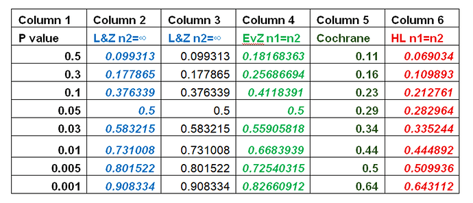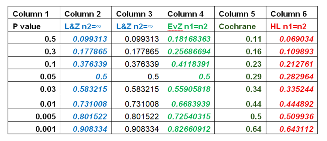 Columns 2 to 6 of Table 1 show the probabilities of replication for different P-values from P=0.5 to P=0.001 as laid out in Column 1. The probability of replication for both methods HL and EvZ are in Columns 2 and 3 when n2 = ∞. Column 4 shows the probabilities of replication using the EvZ expression when n1=n2. Column 5 (Cochrane) shows the probabilities of replication arising from the Cochrane data as described in van Zwet, E. W., & Goodman, S. N. (2022) (see (link) in post number 50). Column 6 sets out the probabilities arising from HL’s expression when n1=n2